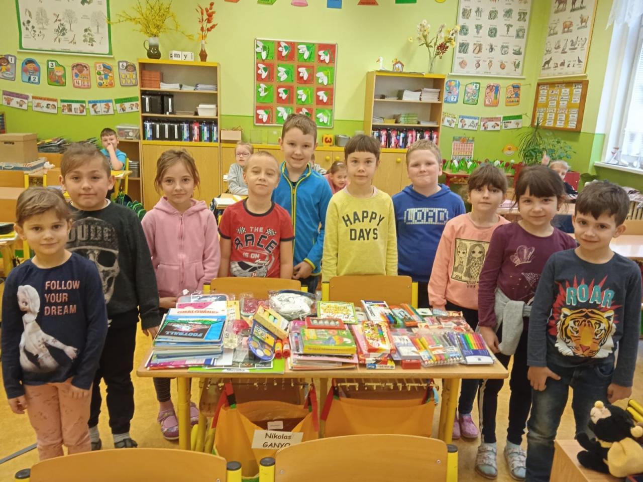 Žáci a jejich rodiče naplnili několik desítek krabic školními pomůckami pro ukrajinské děti.