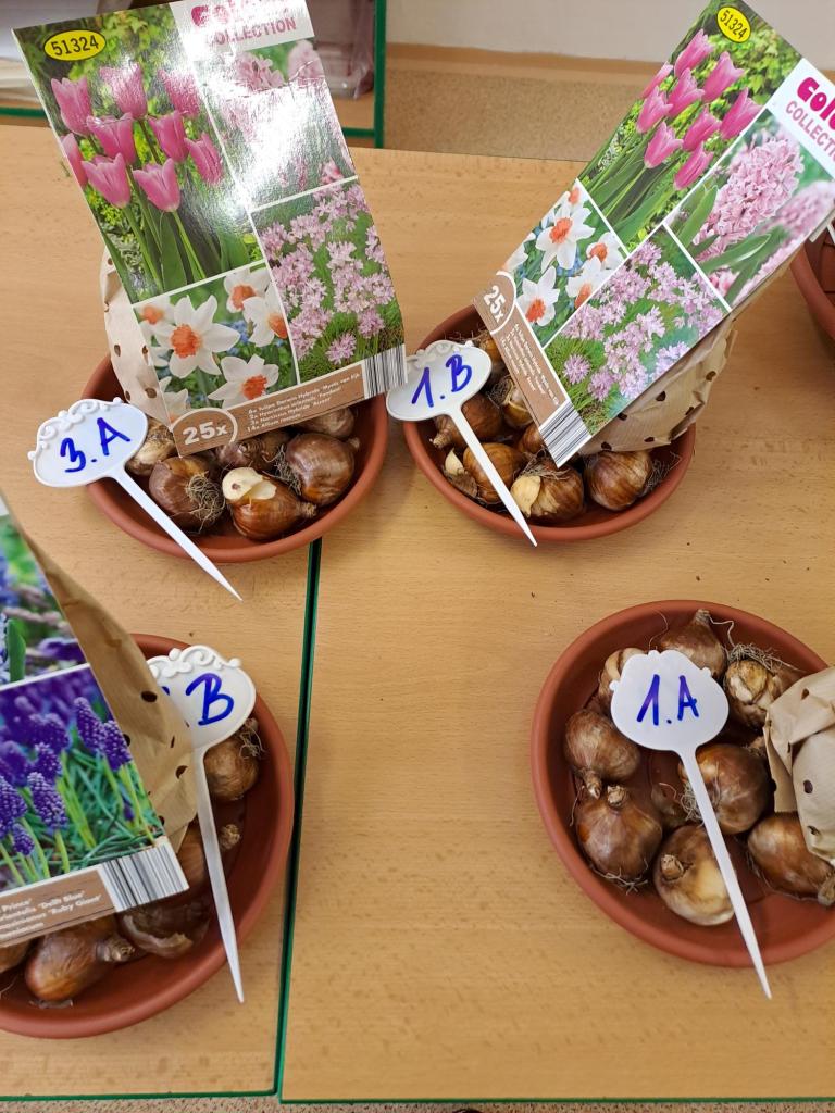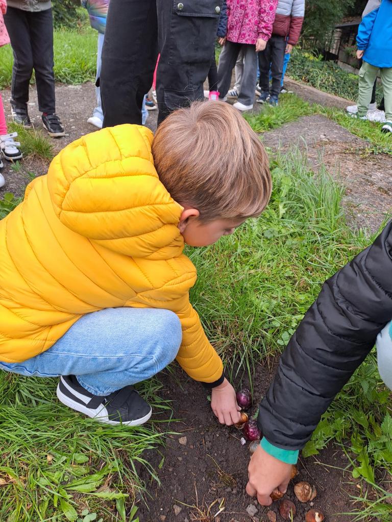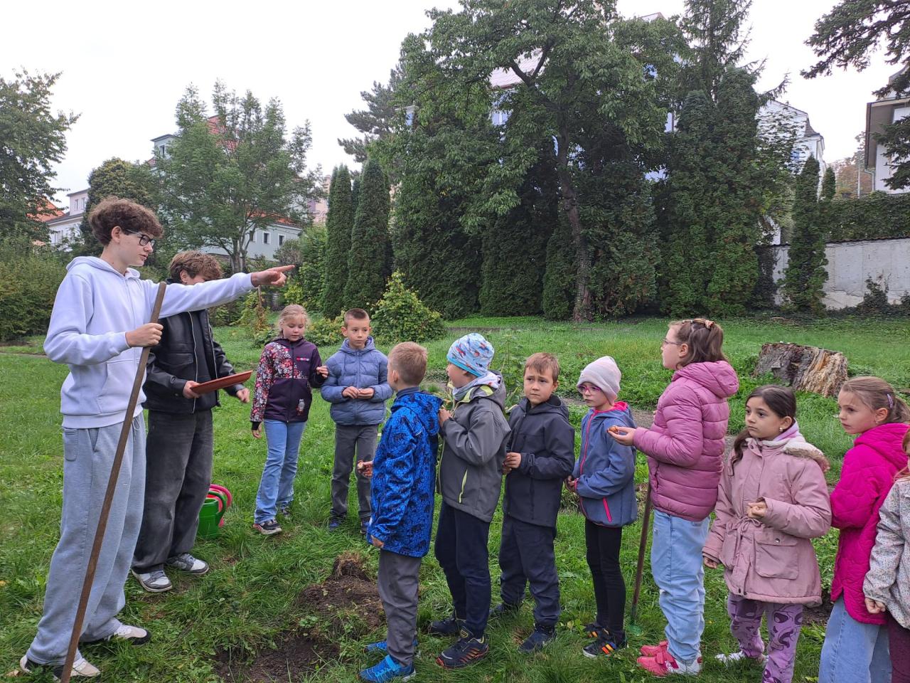 Vybraní žáci 9. A pomáhali mladším spolužákům z 1. stupně s výsadbou okrasných cibulovin.
