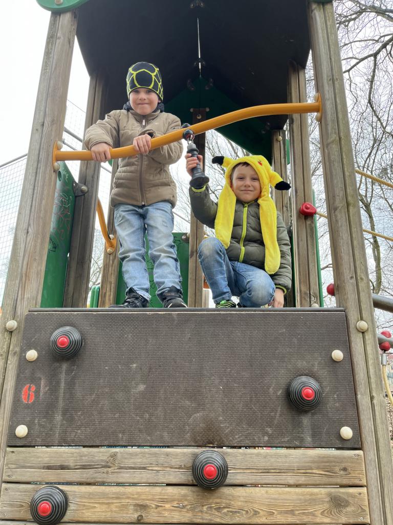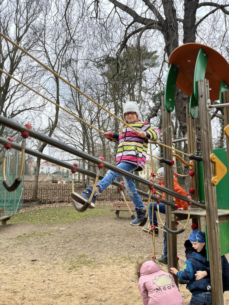 Krásné počasí nás vyhnalo ven, kde trénujeme Housenku - snažíme se projít celý park bez přetrhnutí. Zatím se nám to nepodařilo… ale my se nevzdáváme. Na hřišti si odpočineme a nebereme sílu.